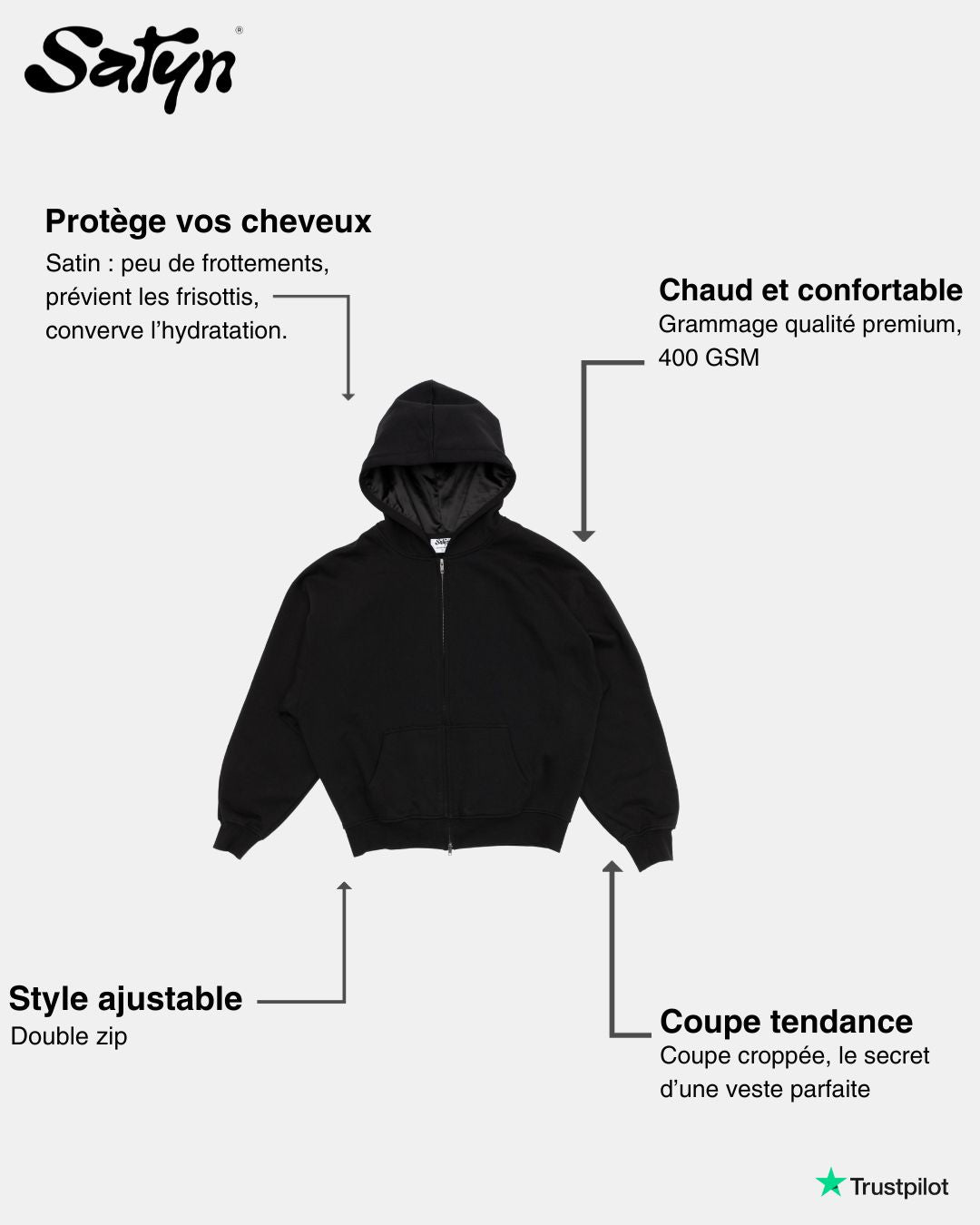 Kapuzenpullover mit Reißverschluss innen aus Satin Noir de Jais V2