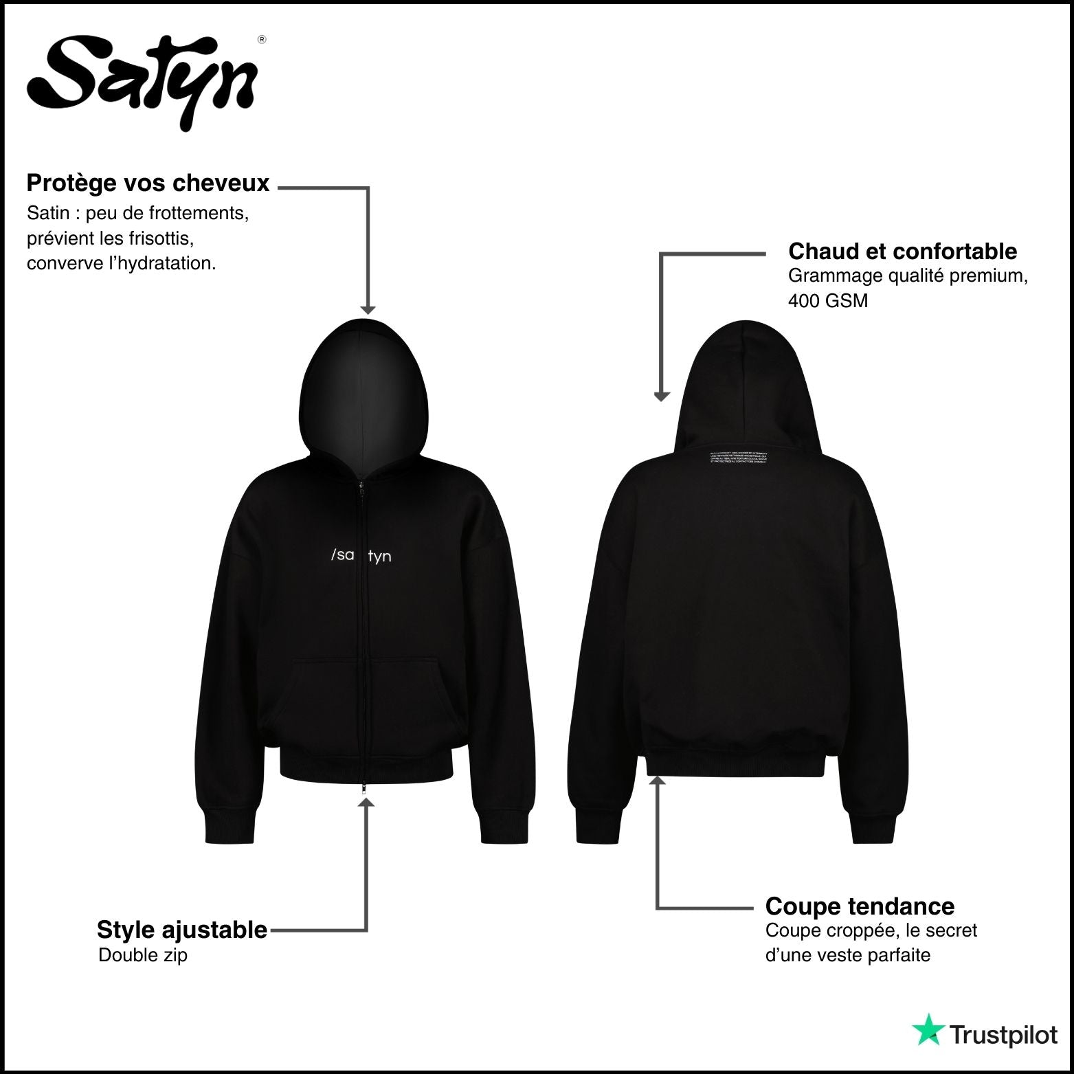 Hoodie Zip /satyn - Noir de jais Prix de vente£99