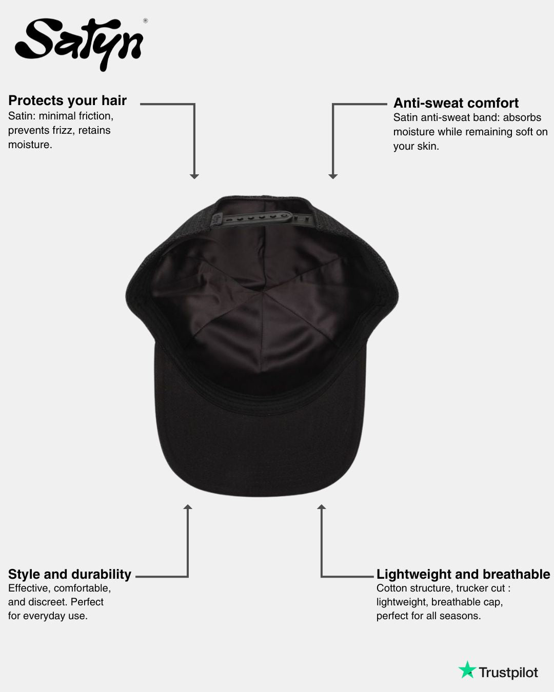 Creëer een streetwear-look en verzorg tegelijkertijd je haar met onze Satyn-pet. Speciaal voor modeliefhebbers die hun haar ook willen verzorgen en verzorgen. Deze trendy pet met satijnen voering beschermt je haar en zorgt ervoor dat het niet pluist.