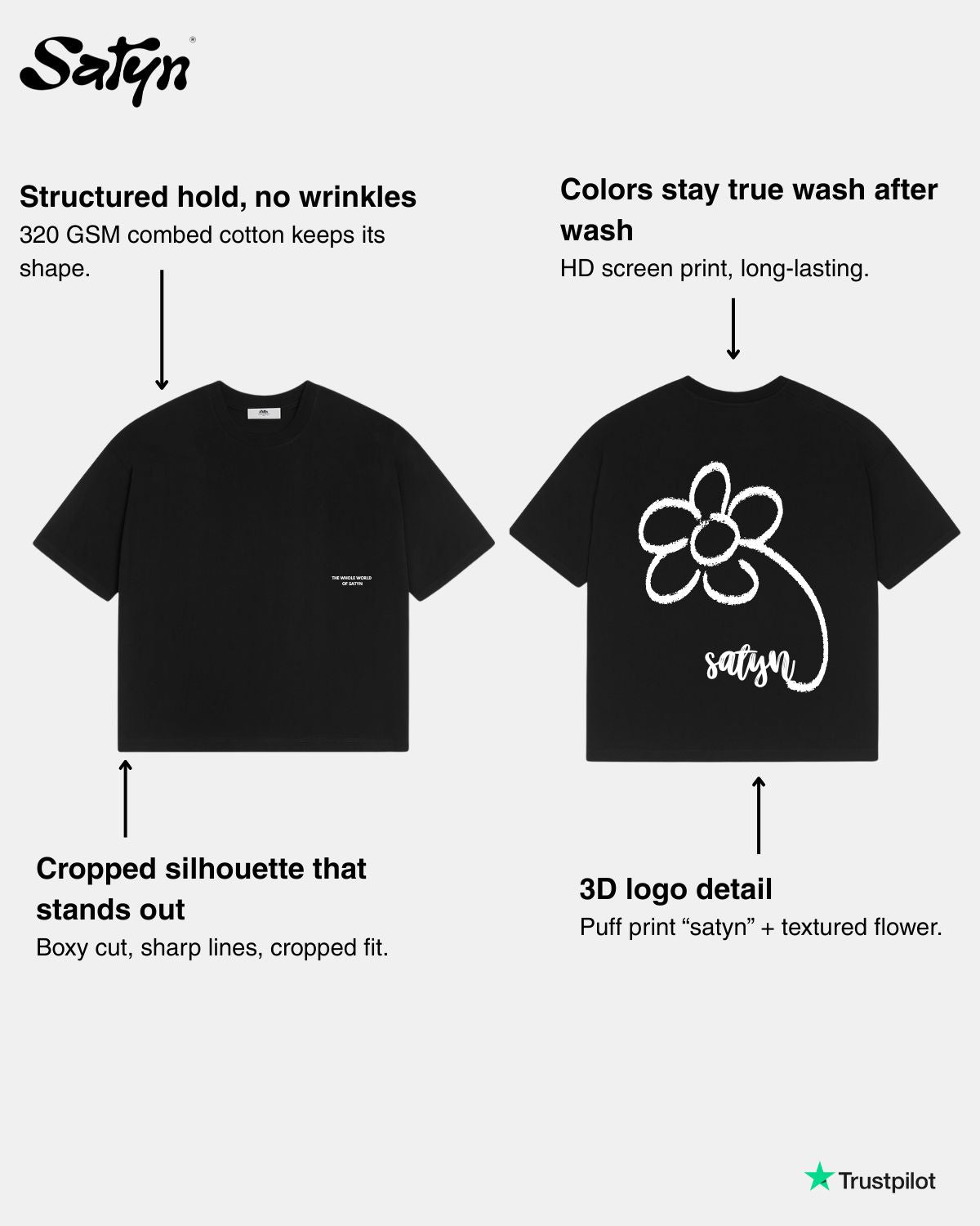 The Bloom Tee captures Satyn’s search for the perfect everyday cut. Crafted from heavyweight 320 gsm combed-cotton jersey, it hangs boxy and cropped with relaxed, dropped shoulders for a clean, structured drape. Up front, a 3-D puff-print “satyn” logo pairs with a tonal bloom graphic and text for subtle depth. Pre-shrunk and softly knit, it keeps its shape and comfort wash after wash.